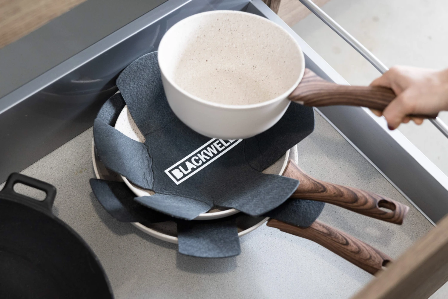 Jouw pannen gemakkelijk in de kast bewaren? Dankzij deze Blackwell Pannenbeschermers – 2 stuks beschadig jij je pannen niet! De pannenbeschermers kunnen eenvoudig in elkaar worden geplaatst, zonder dat de bodem de andere pan beschadigt. Handig toch? De panneschermers zijn gemaakt van siliconen en kunnen dus eenvoudig met een vochtige doek worden afgenomen.