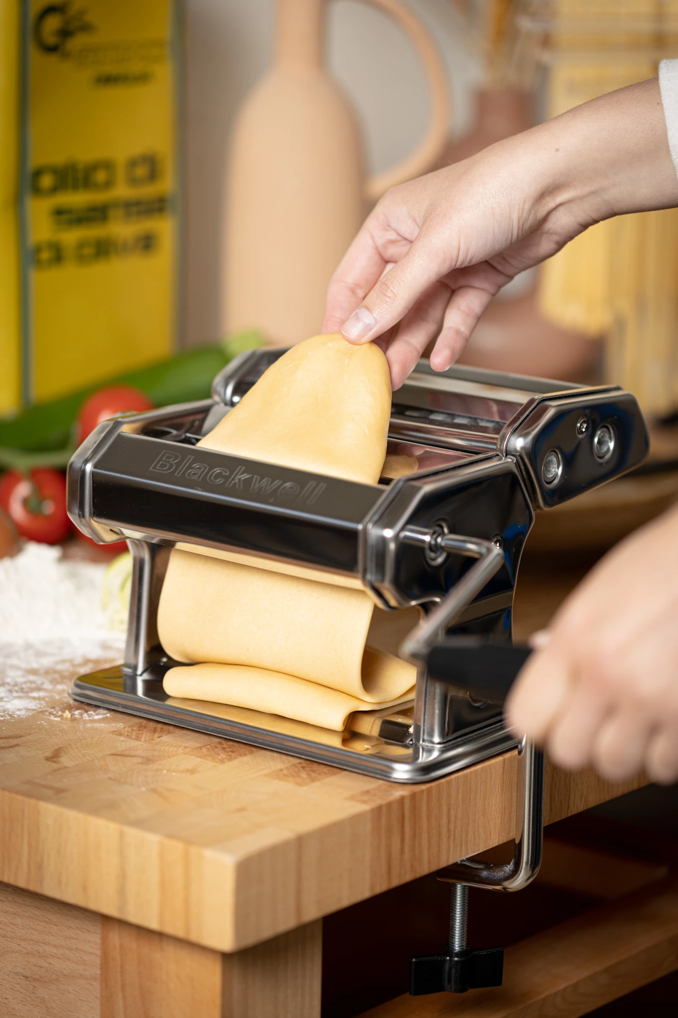 Met deze volledige Blackwell Pastamachine Set bereid je eenvoudig en snel verschillende soorten pasta. Kneed deeg van eieren en bloem en maak je eigen spaghetti of tagliatelle. De pastamachine wordt geleverd met een montageklem, waardoor je hem stevig op zijn plaats kunt houden tijdens het draaien. Met de draaiknop aan de zijkant stel je de gewenste deegdikte in.
