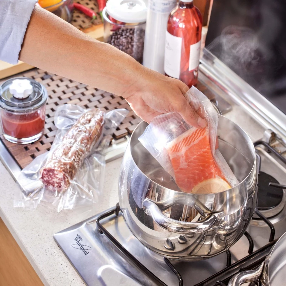 Garandeer dat er geen lucht of vocht meer bij je voedsel kan komen door te vacumeren met deze vacumeerzakken van Espressions. Door te vacumeren kan je voedsel tot wel vijf keer langer bewaren en de smaken blijven behouden. Met de dikte van 240 micron zijn deze zakken van hoge kwaliteit en ze zijn BPA vrij. De formaten van deze zakken zijn 30 bij 40 centimeter en het zijn er 50 stuks. Ook geschikt voor sous vide koken! Let op: het sous vide koken is veilig en getest voor 100? voor 1 uur, 90? voor 8 uur, 70? voor 72 uur.
