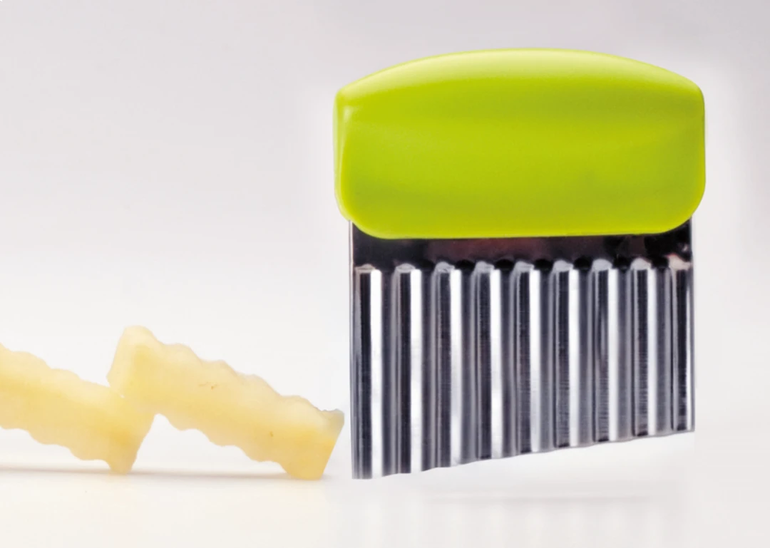 Met de golfjessnijder van Cookinglife snijd je heel gemakkelijk gegolfde plakjes van wortels, komkommers, aardappelen, kaas, bananen en meer. Het snijblad is gemaakt van scherp roestvrij staal. Het gebolde handvat is van kunststof. Na gebruik mag hij in de vaatwasmachine.