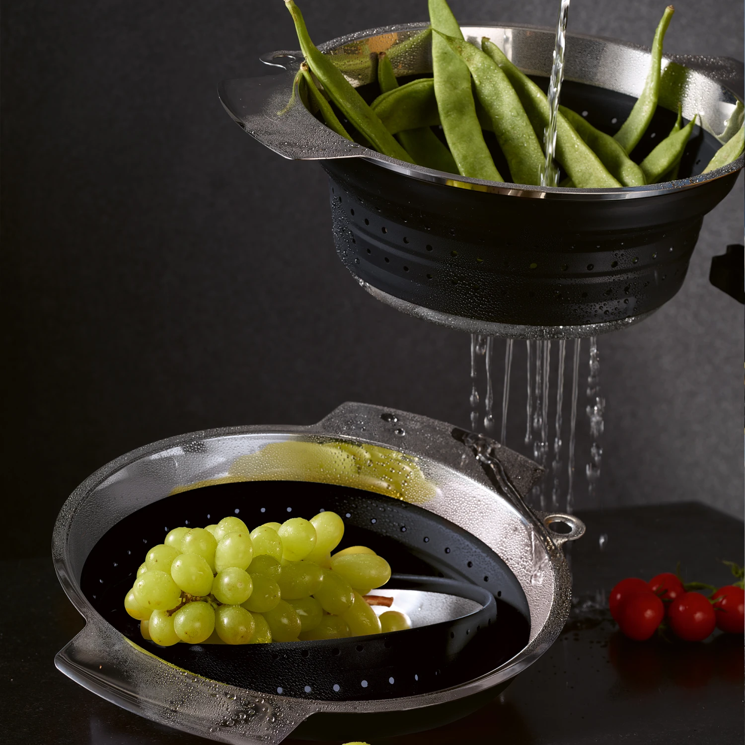 Bij het afgieten van een heerlijke pasta is een vergiet natuurlijk onmisbaar! Dit handige keukenhulpje is in vele situaties te gebruiken en kan dan ook echt niet ontbreken in jouw keuken. De Rosle Vergiet Opvouwbaar is gemaakt van roestvrij staal en siliconen. Doordat hij op te vouwen is neemt hij erg weinig ruimte in beslag: opgevouwen is dit vergiet namelijk maar 4.1 centimeter hoog. Door de fijne handvaten is dit vergiet gemakkelijk vast te houden.