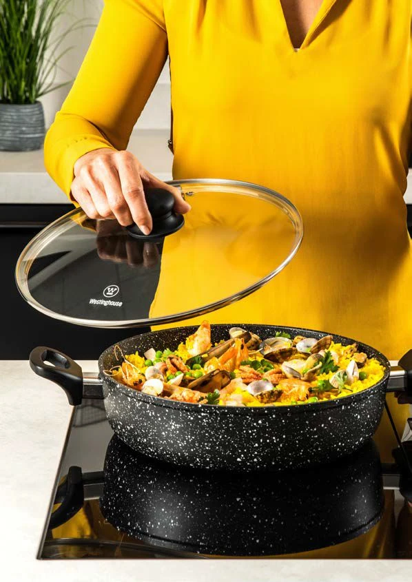 De pannen uit de Westinghouse Marble Collection zijn perfect voor in ieder huishouden! De pannen zijn voorzien van een innovatieve anti-aanbaklaag die 100% gegarandeerd vrij is van PFOA en andere schadelijke stoffen. Ze hebben een snelle en gelijkmatige warmteverdeling. Ook zijn de pannen gemakkelijk te reinigen in de vaatwasser en geschikt voor alle soorten warmtebronnen. Bij deze collectie heb je de keuze uit pannen met een zwarte of houten look handvat.